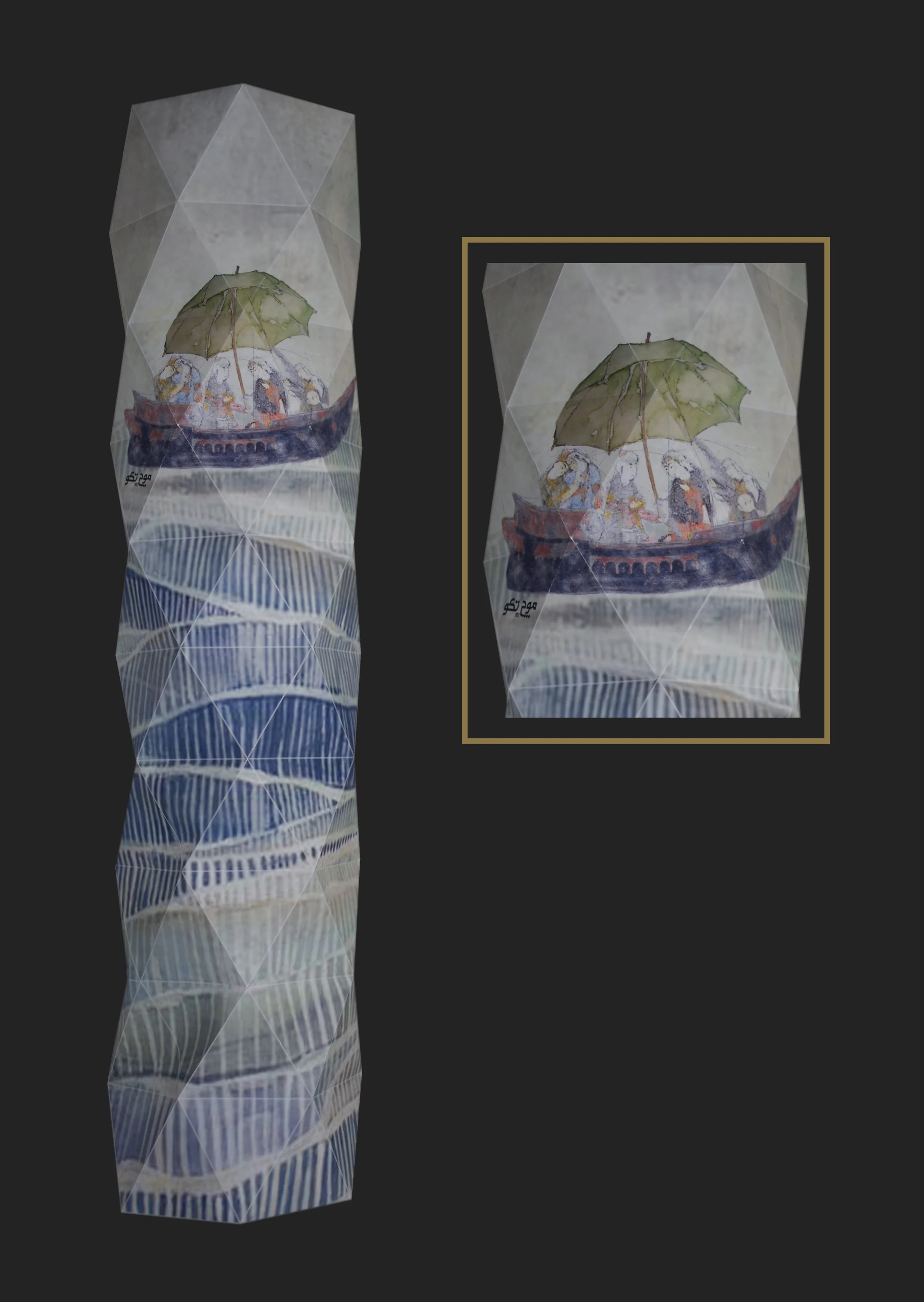 This is an origami-based packaging design for the same brand, created as a playful cover for an umbrella. The design features characters inspired by Persian miniature paintings holding an umbrella, adding a light and imaginative touch to the packaging.