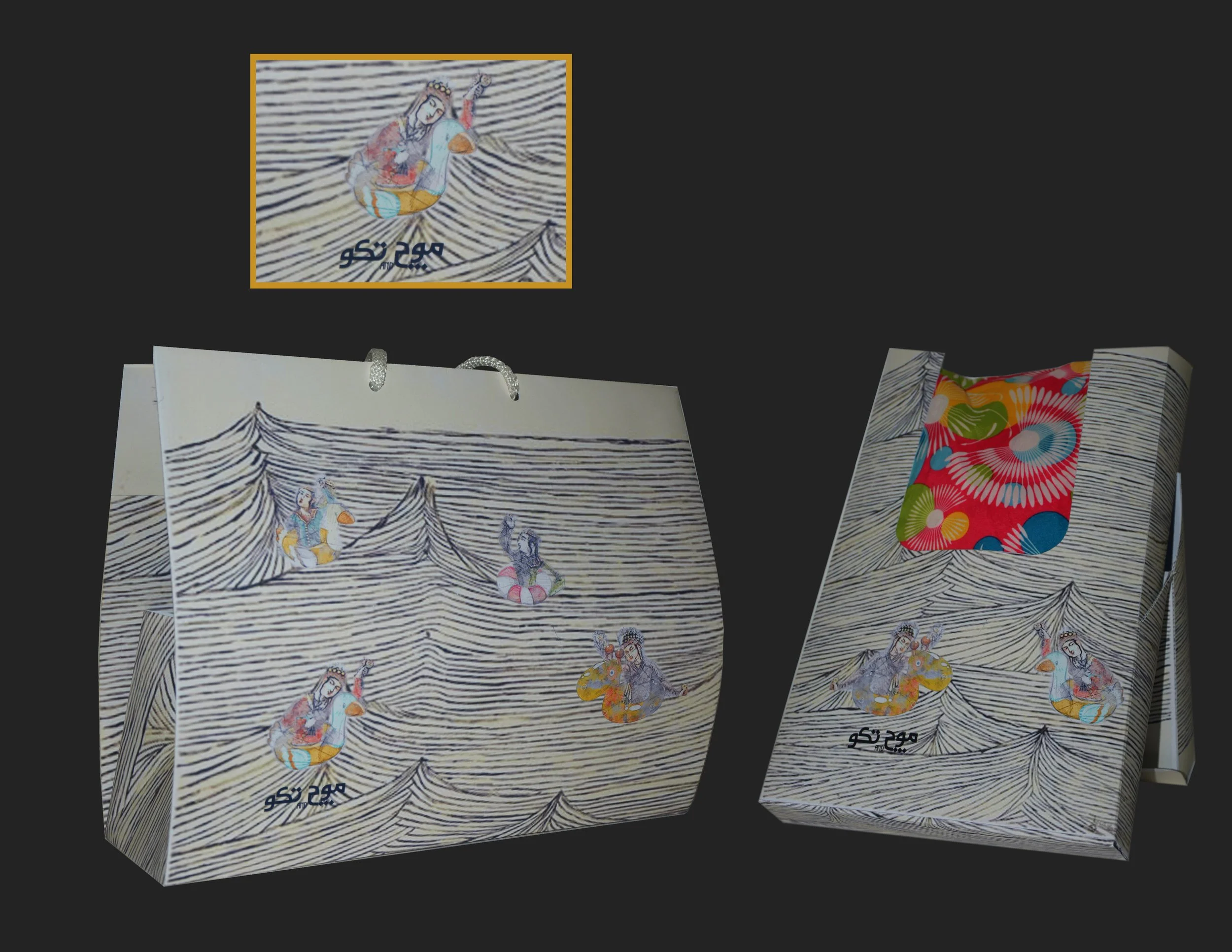 These are packaging designs for the Mooch and Takoo summer collection. For the structure of the boxes, I used origami techniques to create foldable and reusable packaging. For the visual design, I incorporated characters inspired by Persian miniature paintings and combined them with swim tubes to create playful summer scenes. A wave-like texture in the background adds the feeling that the characters are floating on water, reinforcing the light and joyful atmosphere of the collection.